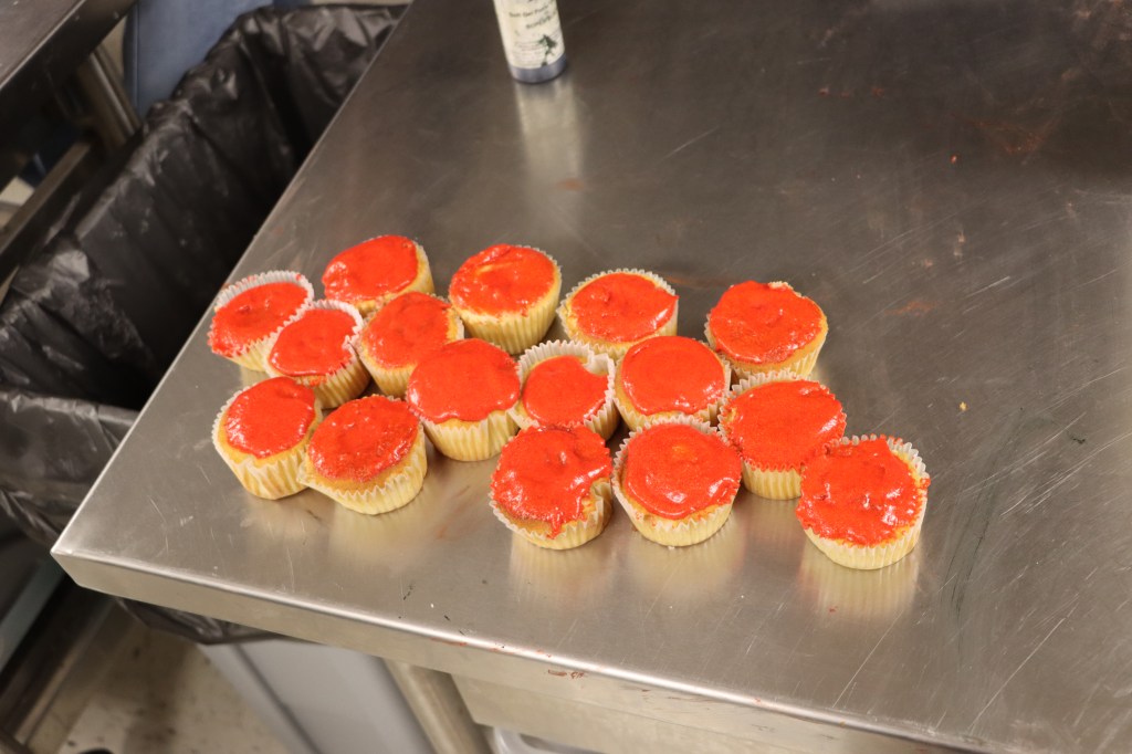 “Spiderweb” cupcakes. The team ran out of time before they could draw the spiderwebs.