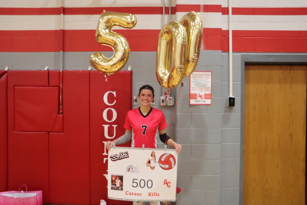 The following week, ACHS hosted Senior Night and Pink Out Night for the volleyball team. During the match against Prairie View, senior Jordan Miller reached an impressive milestone in her volleyball career – 500 career kills. She’s known for her strong hits and her leadership on the court. Jordan has been a key player since her freshman year. Throughout the season, she has consistently shown effort and determination, helping to lead her team to several wins.